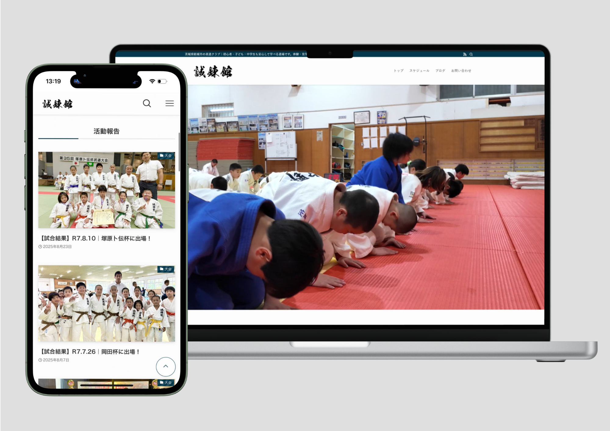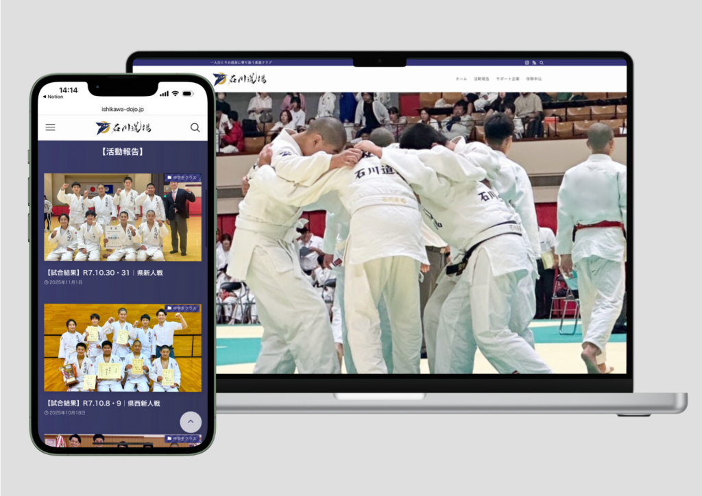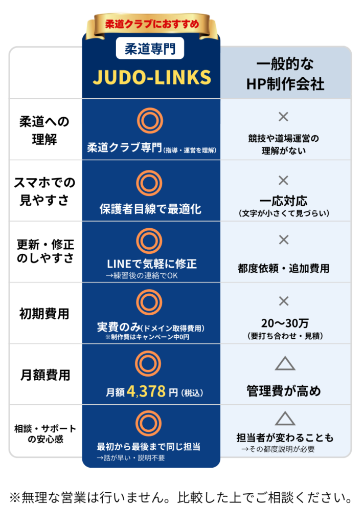 柔道クラブ・部活動向けにあらかじめ構成やデザインを用意しているため、一から作るよりも制作コストを大幅に抑えられます。